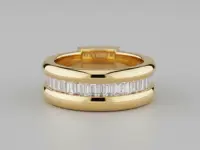 This stunning band features a row of baguette cut diamonds secured in a channel that extends halfway down the shank for eye-catching sparkle.